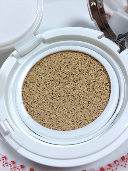 櫃姐介紹說他們家氣墊粉餅採用雪絨草精萃做成,拍的時候會有美白效果,也號稱拍氣墊粉餅可以降溫...目前兩項在我臉上感受不大...廣告言詞聽聽參考就好