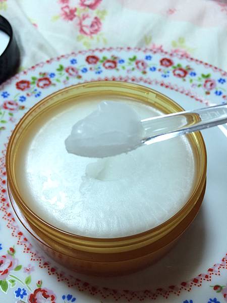 我平常是挖兩勺在手心,用雙手的溫度融化後在臉上做按摩溶解彩妝